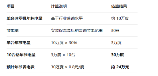 基礎數據:一臺中型注塑機(假設功率為15kW)的年耗電量巨大。其加熱圈部分(即保溫套主要節能對象)的耗能約占整機能耗的30%-40%。